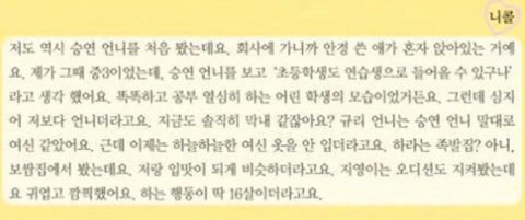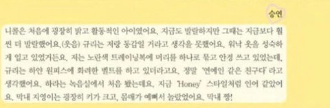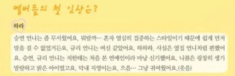 한승연: 나랑 동갑이 생겼다며 나에게 인사하는데 이 조그만 건 뭐야? 라고 생각했다.