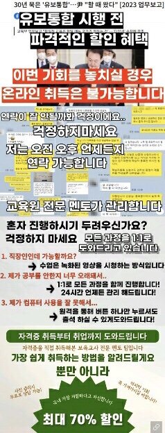 유보통합의 장점이 무엇인지는 저 또한 매우 의문스럽습니다만, 굳이 꼽아본다면 6개월 학점은행제 과정을 이수하신 분들에게는 유아교육과를 졸업하지 않고도 유치원 교사로 일할 수 있는 기회이기 때문에 이득이라고 할 수 있겠습니다. 실제로 사교육 시장에서는 이러한 점을 이용하여 아래와 같이 적극적으로 학점은행제를 이수하도록 홍보하고 있습니다.