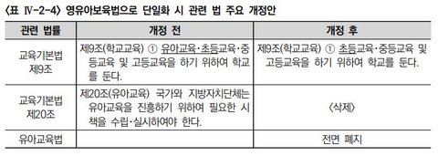 유보통합이 구체적으로 어떤 방향으로 이루어지는 것인지 교사들의 꾸준한 질의가 있었으나,교육부는 '정해진 것이 없다'라며 무책임한 자세로 일관하고 있습니다. 이러한 상황에서 교사들은 현장의 의견 수렴 없이 유보통합이 졸속으로 추진될까봐 매일 전전긍긍하고 있습니다. 아래는 '육아정책연구소'라는 기관에서 2022년 9월에 발표한 '유아교육·보육 통합을 위한 단계적 추진 방안' 중 일부입니다. 아래 개정안과 같이 유아교육법이 전면 폐지된다면,임용고시를 합격해 공립유치원의 교원이 된 사람들은교육공무원의 지위를 박탈당하게 됩니다.정당한 절차를 걸쳐 얻어낸 교육공무원의 지위와 신분을누가, 어떤 자격으로 폐지하겠다는 걸까요?비록 정부나 교육부에서 발표한 정식 개정안이 아닌,육아정책연구소라는 보건복지부 산하의 기관에서 단독으로 진행한 연구라 할지라도,이러한 논의가 진행되고 있다는 점이 교사로서 매우 개탄스럽습니다.또한, 이러한 말도 안 되는 정책이 허울 좋은 정책으로 변모하여유아들의 교육과 성장에 악영향을 미칠까봐 두렵습니다.유아교육에 대한 전국민적 관심이 절대적으로 필요한 때입니다.함께 분노하고, 주시하고, 힘을 보태주세요.