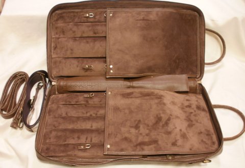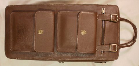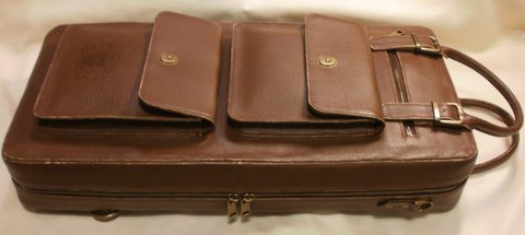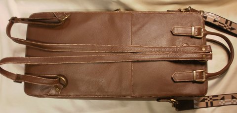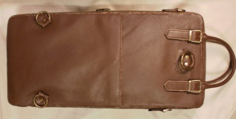 브라운 컬러 엠보싱 가죽으로 다량의 스틱과 부품 및 소지품 등을 수납할 수 있으며 핸들,숄더,멜빵 끈 등을 필요에 따라 숄더백,백팩으로사용할 수 있도록 제작한 천연 가죽 빈티지 드럼 스틱 가방(드럼 스틱 케이스)입니다.(마디샤)