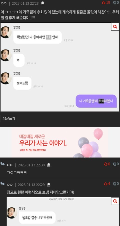 진짜 니 가족땜에 늘 ㅈ같아서 후회 맨날 하는데 뭔