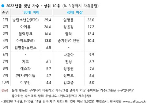 트와이스, 아이브, 뉴진스, 르세라핌, 엔믹스, 케플러, 레드벨벳, 소녀시대, 방탄, 엔시티, 엔드림, 스키즈
