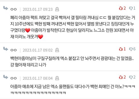 아무도 댓글 안 달았는데 이런 글 먹금도 못해서 백현 까댓 주르륵 쓰고 혐혐 거리면서 멸칭으로 팰 땐 언제고 이젠 백현팬들이 타멤을 팼단다 먼저 백현팬 건 기억도 안나나봐 맨날 백악개 타령하면서 갤럭시 쓰는 누구팬아 티가 너무나서 흐린눈도 못해줄 정도임 제발 백현 좀 그만 까고 다녀 백현 까글만 몇개를 써놓고 안깠다는 건 양심이 있는 거야 없는 거야 나야말로 평화롭게 좀 살자 제발