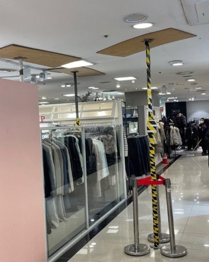 이날 오후 온라인 커뮤니티 맘스홀릭 베이비 카페에선 NC백화점 붕괴를 우려하는 게시글과 사진이 올라왔다. 사진에는 NC백화점 내부 천장 붕괴로 안전봉을 설치했고, 기둥에 부착된 유리가 부서진 모습이 담겼다. 게시글을 올린 작성자는 "완전 무섭다. 2층에는 천장 다 금가기 시작했다. 계속 운영 중"이라고 적었다.