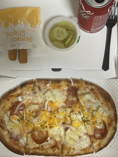 하와이안피자랑 치즈스틱!