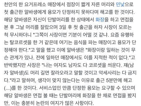 여기 우리동네라 잘 알고있는데 면접때 단발머리에 풀메한 상태로 갔는데 첫 출근때 여자가 투블럭 생얼로 탈코하고감 그래서 잘렸어 어케생각해?