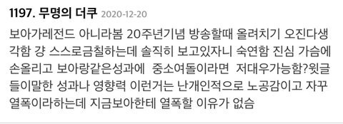 감없고 고집쎄고 오만한데 트렌디한척 털털한척 하니까 캐릭터가 공감을 못사는거임... 에스엠이 만들어준 이미지에 심취해서 진짜 스스로 금칠했다는 표현이 딱이네 프듀때까지만해도 이정돈 아녔는데 확실히 요즘 비호감이야