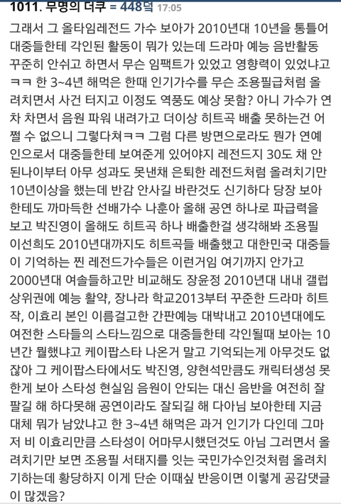 저거 쓴 사람이 몇년도생인데? 나는 보아 데뷔때 초딩이었던 아줌만데 보아 파급력 엄청났는데..? 그땐 니뽄스타일 이라는 말이 있을정도로 지금 한류처럼 일본문화가 주류였어 보아 일본활동도 당연히 국내에서도 보도될 정도로 네임벨류 대단했고 당시 10대 20대 들한테 인기 많았어 특히 나 중딩땐 다들 보아스타일로 입고 고딩땐 울프컷ㅋㅋㅋ 추억이당 대중적으로 굉장히 유명한 가수 맞아 지금 비교대상 없어 독보적이었거든ㅋㅋ 보아 팬 아닌 내 체감삼 3년 반짝이 아니라 10년정도? 미샤, 핸드폰 씨에프 티비틀면 보아 광고가 많았구ㅋㅋ 판 눈팅하는데 요즘 보아가 밉보였는지 많이 까이고 평가 절하당하는것같아서 실지 당시대에 살던 아줌이 댓 남겨봐ㅋㅋ