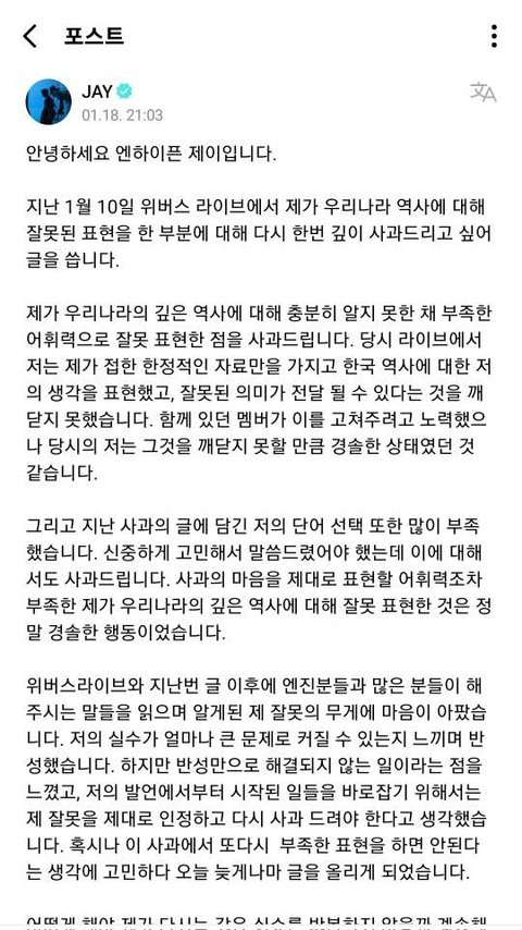 제이 한국사 폄하 사과문 방금 다시 올라옴
