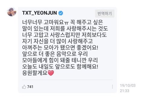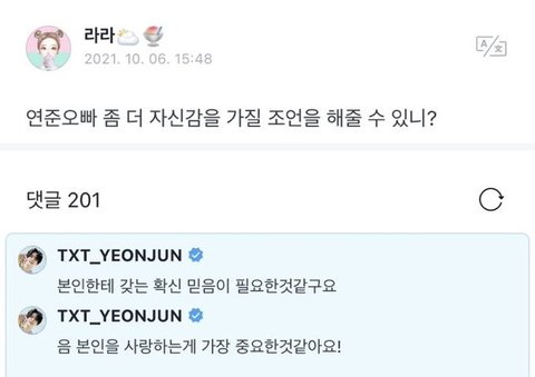 연준이를 좋아하는 이유는 셀 수 없이 많지만, 그 중 하나를 꼽는다면 자기 자신을 사랑할 줄 안다는 점인 것 같아요. 저는 저 자신을 사랑하는 게 어려운 사람인데 연준이를 보면서 많이 배웠어요. 자기 자신을 사랑할 줄 알고 사랑으로 가득찬 아이라서 좋아해요