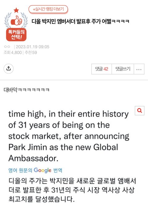 진짜 지겹다 안궁금해 자꾸 어떻게든 꼬투리잡으려고 자꾸 글올리려고하는걸로 보여 하도난리라 나도 여기저기보니 별거없던데 이난리인지 그라고 주가 8일전에ceo변경으로 2프로올랐데 몇일후 지민이가 엠버되고 더올랐어 그럼 그럴수도있겠다생각도 드는데 외국기사도 있더라 그게 어디건지 모르지만 쨋든 100프로 지민이탓아닐수도있지만 100로 ceo변경건이라고 말하기도 그렇지않나 왜이리 까고싶어서 난린지 내가정병온다 여기가 자기네들만쓰는덴줄아나