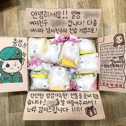 곰신해봤는데 저거 ㄹㅇ아무리 적게 잡아도 기본 10은 들어. 물론 받으면 잠깐 남친 기살고(대부분 솔로니까 저렇게 정성 들이는 여친이 있다는게 부러운거) 그럴 수 있는데 저거 한다고 군생활편해지거나 하는거 아님..ㅋㅋ그리고 결정적으로 저런거 하는 애들이 꼭 헤어짐 왜냐하면 정성 들인만큼 바라는게 많아지는데 그걸 충족해주기가 쉽지않거든..결론은 걍 하지마 저거 할돈으로 남친이랑 맛난거 하나 더 사먹어