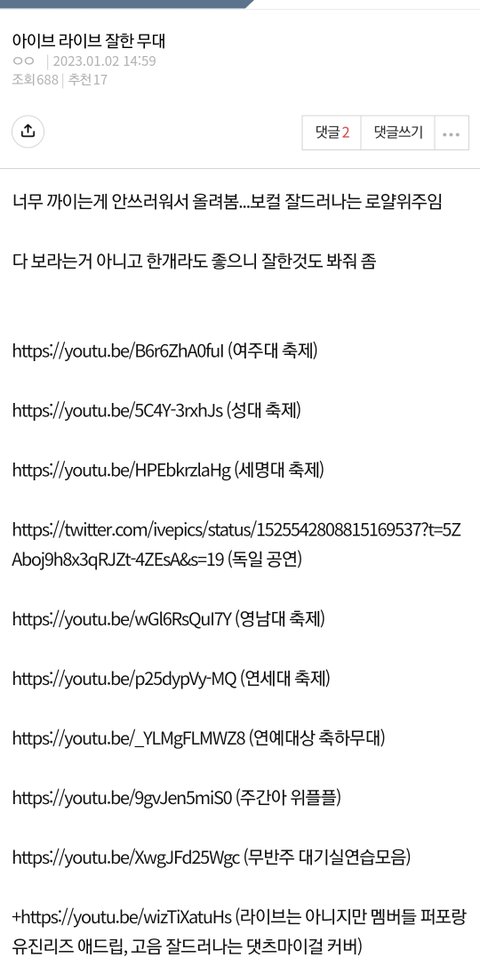 아이브 그동안 라이브 한 무대들 꽤 많아 이거 외에도 연말 무대들 라이브 있고... 라이브 꾸준히 하면서 열심히 하는 그룹인데 너무 심하게 내려치기 당하는거같아서 속상함
