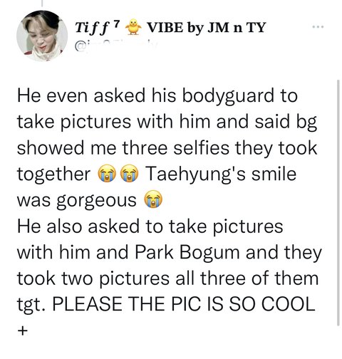 그리고 태형은 자기랑 보검이랑 함께 사진찍어달라고 그에게 부탁하기도 했고, 보디가드와 그 둘이 함께(셋이) 사진 두장을 찍었다.