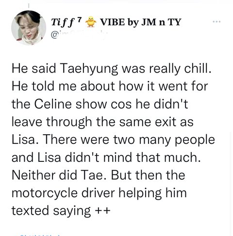 그는 리사랑 같은 출구로 떠나지 않았기 때문에 셀린느 쇼가 어떻게 진행됐는지 말했다. 거기에 엄청 많은 사람들이 있었고 리사는 그다지 신경쓰지 않았다. 태형도 그랬다.