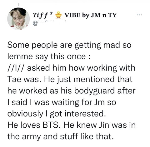 내가 그에게 태형과 일하는게 어땠는지 물었다. 내가 지민이를 기다리고 있다는 말에 그가 보디가드로 일한다고 말했던거고