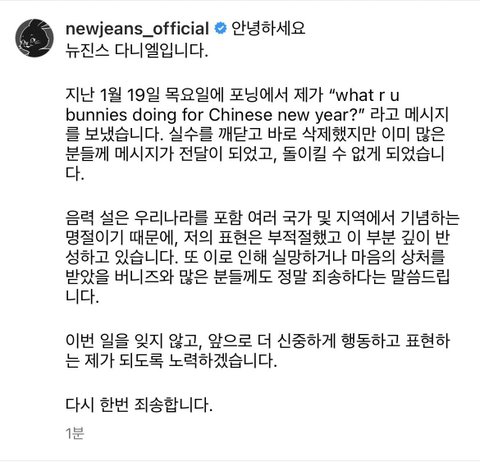뉴진스 다니엘 사과문