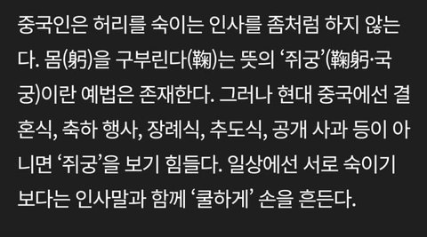 중국은 자기보다 밑인 사람에게 허리 숙이면 안되서 고개만 까딱하는거임 옆에 멤버들처럼 90도 인사 절대 못함