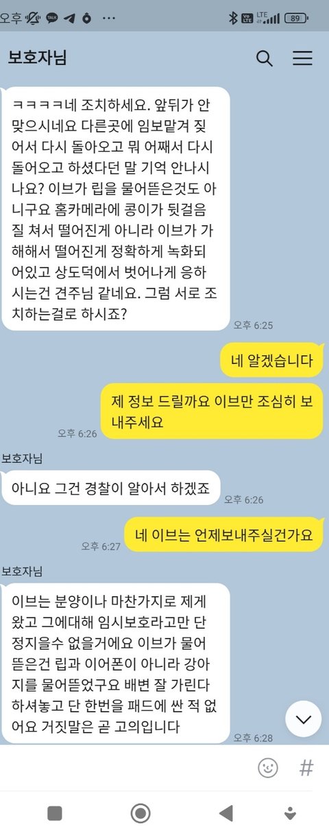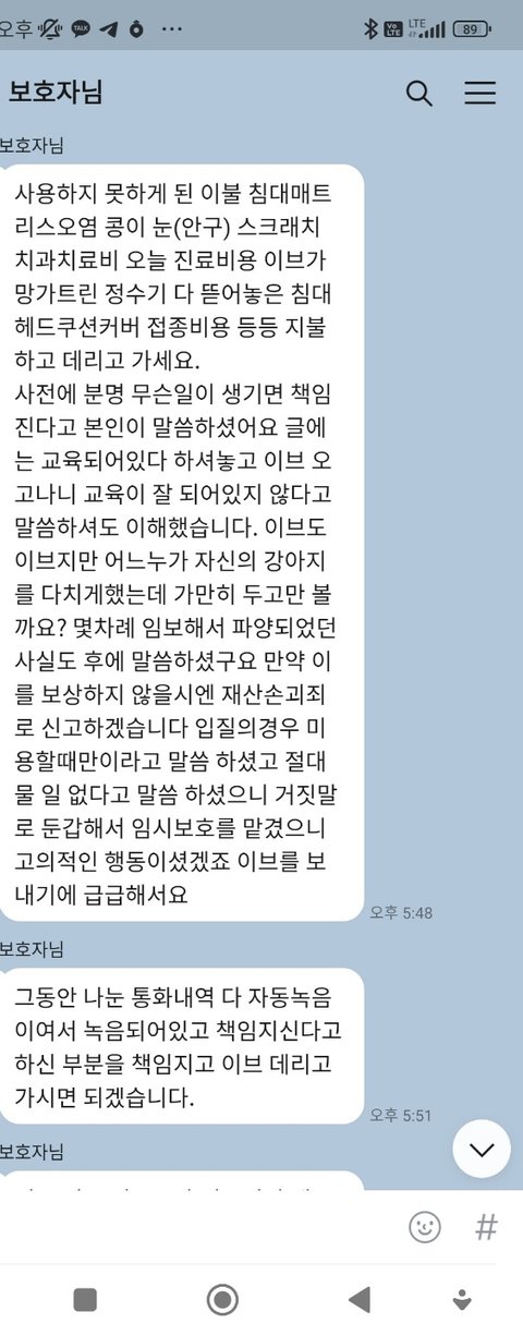제가 혹시 무리한걸 요구했나요? 저도 견주인데 이브가 피해를 입혓으면 배상 요청을 하셧으면 기본적은거 보여달라는건데 실수했나요? 비하하면서 하나도 안보내주고 이브는 못돌려 준다하고