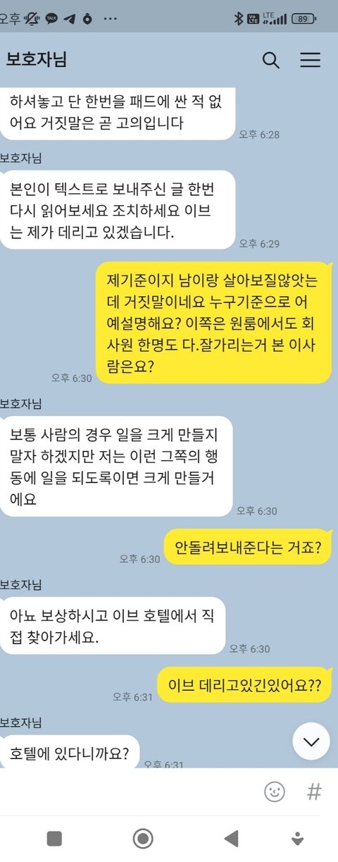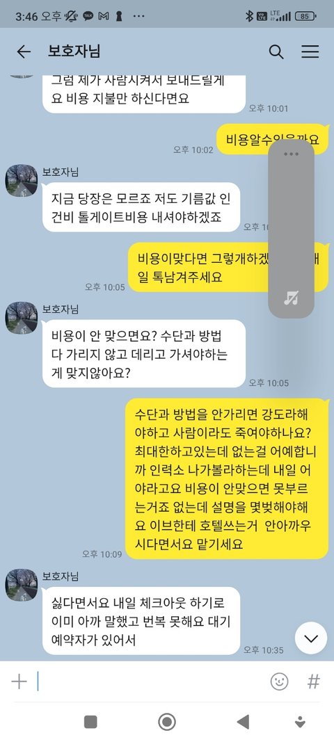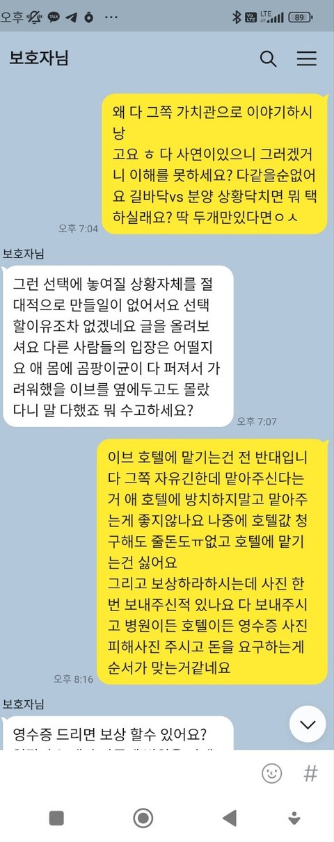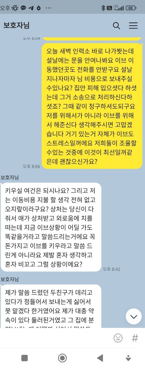명절이라 전화안받고 저보고 어떻게 해달라는건지 모르겠습니다 호텔비는 백번내도 이브한테는 미안한거 없다하시면서 약속시간이 안되어 보호자 비용으로 좀 붙여주세요 사정사정 다 설명해도 싫다고만 하시고 데려가라고 하시고