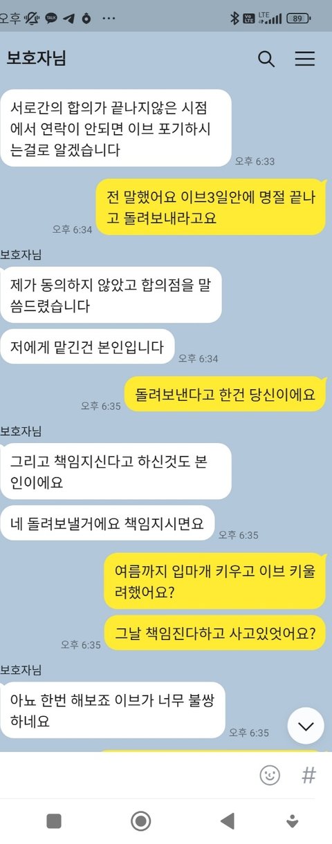 솔직히 말하겠다 하셧습니다 제가 이브한테 정들어서 그런거 같다고...이브그냥 다시 제가 키울테니 여름까지 꼭 맡아주시겠다고? 키우겠다 데려가라 카톡상에 번복이 굉장이 많으셧습니다