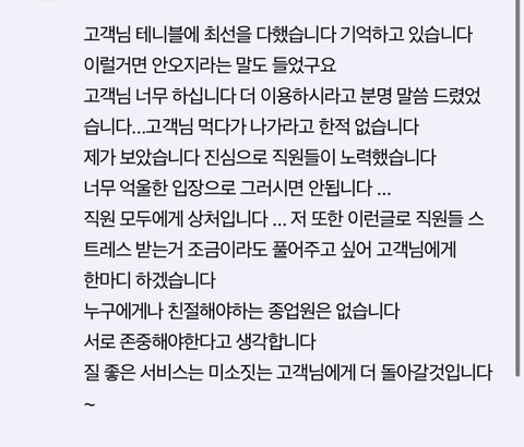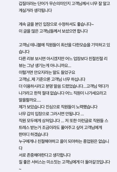 이럴줄 알았음 시간제약 안두는곳으로 장소를 선택하지 않았을까 아쉬운 마음에 리뷰 썼더니 업장에선 서운한다는 얘기만함. 오랜만에 만난 지인들과 후다닥 자리 마무리한 나와 일행들이 갑질일까요 우리에게 뭘 노력했는지 모르겠는 노력을 외치는 업장이 갑질일까요