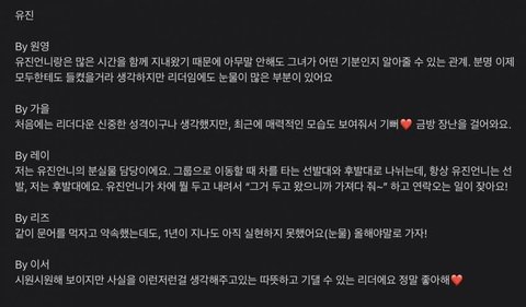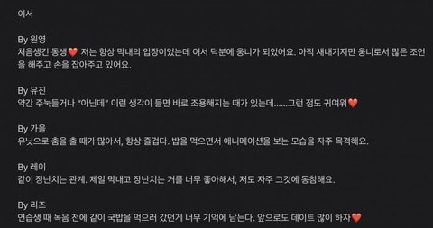 아이브 멤버들에 대해 누구는 어떻다라고 말하는 인터뷰인데 안유진이랑 문어 먹으러 간다고 했는데 못가서 아쉽다, 이서랑은 국밥 먹으러 간게 너무 기억에 남는다라고 썼네 헐 얼마나 음식에 진심이었으면