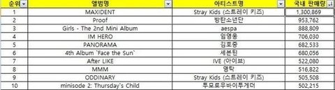 23일 써클차트(옛 가온차트) 2022년 연간 리테일 앨범 차트에 따르면 지난해 국내에서 가장 많이 팔린 음반(리테일 기준)은 스트레이 키즈의 ‘맥시던트’(MAXIDENT)로 총 130만장의 판매고를 기록했다. 이어 방탄소년단(BTS)의 ‘프루프’(Proof)가 95만장, 에스파의 '걸스'(Girls)가 89만장, 임영웅의 '아임 히어로'(IM HERO)가 71만장으로 뒤를 이었다. 맥시던트는 자난해 10월에만 125만장의 판매고를 올렸다.