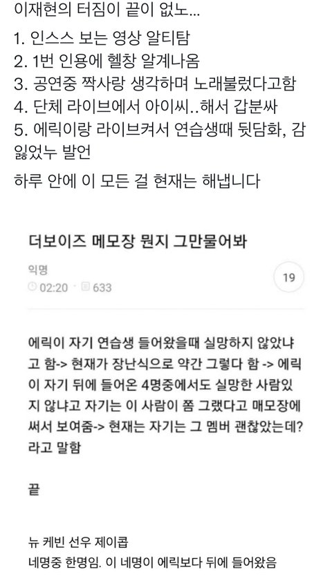 자컨이나 비하인드에서 폰질 ㅈㄴ하고 어제 에릭이랑 둘이한 라이브에서도 폰을 못놓던대 다른 멤버들은 이번년도에 잘하겠다고 하면서 소통도 매일오고 팬들 생각 해주는데 얜 왜이러냐?(현재가 소통 안한다는 뜻아님) 정 떨어져서 탈주한 팬 많은듯