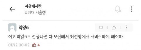 진짜 한남충답다ㅋㅋ 평소에 전쟁 생각도 안하지만 전쟁을 생각하면 적군 혹은 훈련 대피 식량 죽음 이런것부터 생각하지 누가 여고생들 서비스 이런걸 생각하냐 ㅋㅋㅋㅋㅋ 현실은 여고생 강1간하러 가는 길에 적군한테 총맞아 뒤지거나 지뢰밟고 뒤진단다 1등급 돼지고기방패새끼야 ㅋ