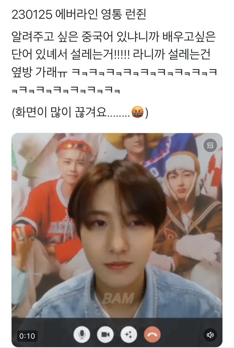 팬분이 설레는 중국어 단어 알려달라고 하니까 자긴 설레는 거 잘 못한다고 옆방 가셔야 할 것 같대ㅋㅋㅋㅋㅋ 옆방에 누가 있길래