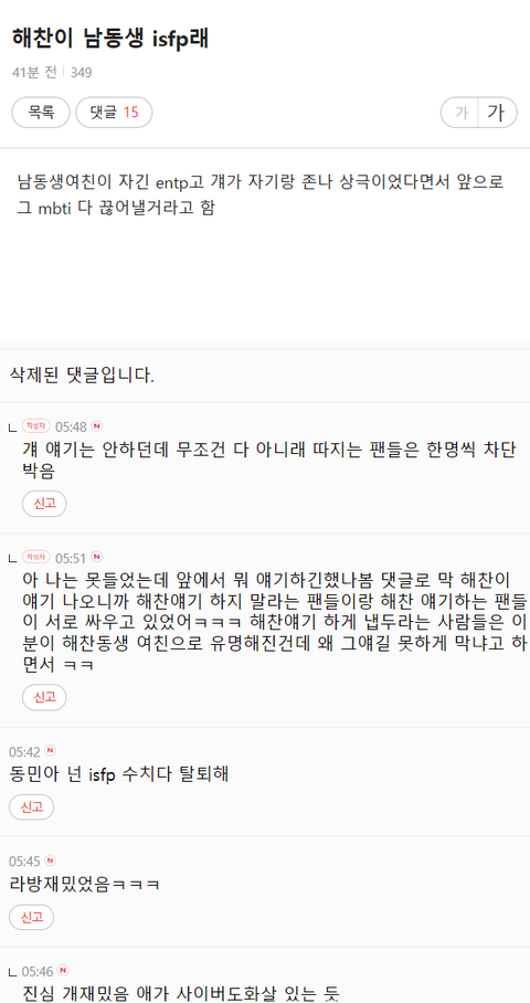 해프들 동민이 패면서 놀고 있었는데 유입돼서 들어온 사람들이 해류 얘기 자꾸 해서 위기감을 느낀건지 음란물 신고 쳐넣어서 라방 강종 시킴