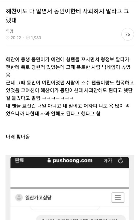 해찬 알계가 동생여친이 올렸던 인스타 스토리들이라며 올린것들중 일부(동생여친 본인은 자신은 올린적이 없고 사생들의 주작이라고 주장중)(주작인지 아닌지는 알아서 판단ㄱㄱ)