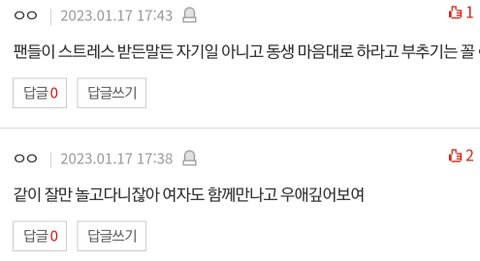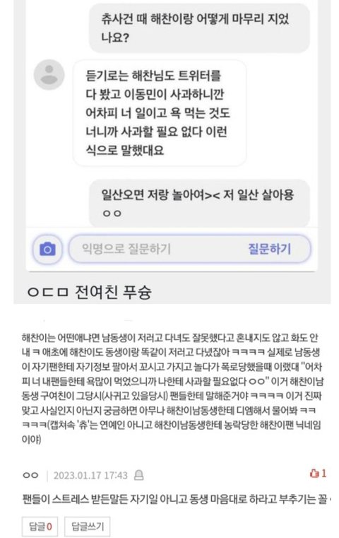 댓글창에 동런얘기 계속 나오고 해찬 복귀해서 런쥔이한테 비게퍼하면 어떨거 같냐 하니까 예진웅니가 게이얘기하는거냐고함