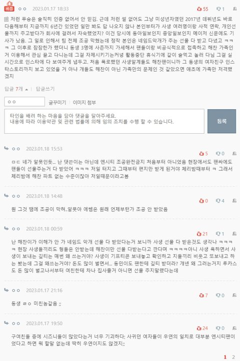 동민이 군인일때 술자리에서 인별 교환하고 사귐 사귈때 동민이가 친구들이랑 홍대 헌포에서 여자 4명 인별 맞팔한거 들켜서 예진웅니가 그여자들에게 일일이 욕박아줬다고함