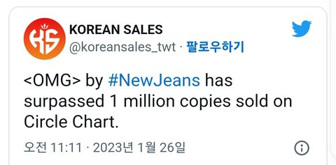 뉴진스 omg가 100만장 넘게 팔려서 단일앨범 최단기간 밀리언셀러 됐다함