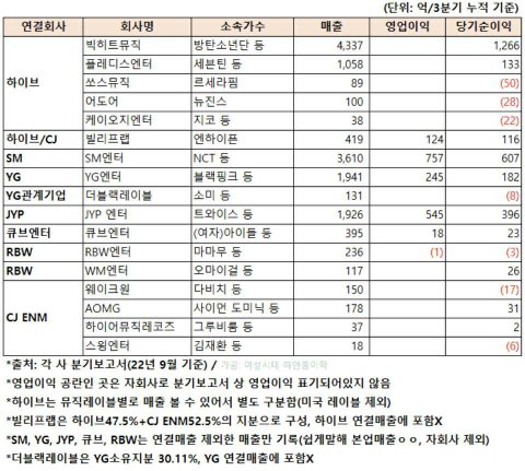 22년 9월 기준 단체활동도 거의 없었던 때고 투어 이런 거 없었는데도 매출이랑 순수익 봐 ㅋㅋ 소속가수 훨씬 많은 타회사랑 비교해봐도 방탄이 압도적임 이정도인데 회사가 아무리 꺾어봤자 꺾이겠냐고