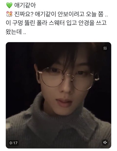 ㅋㅋㅋㅋㅋ오늘 애기같이 안 보이려고 스웨터 입고 안경 쓰고 왔는데 애기같다고 하니까 진짜요?? 이러고 놀람...
