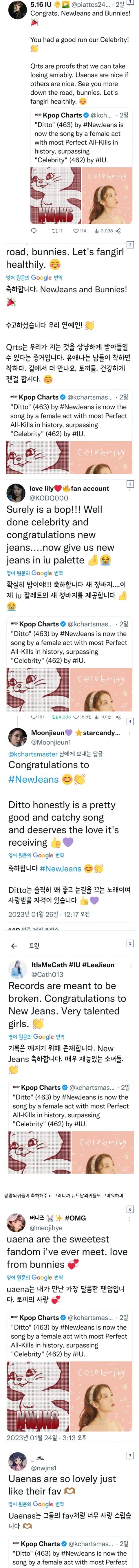 기록 깼다고 축하한다고 응원해줌 화답으로 뉴진스팬들이 고마워함.