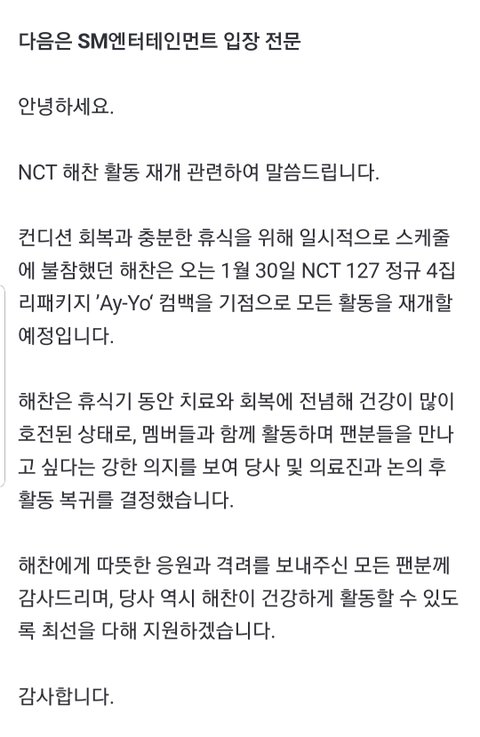 해찬이 복귀기사