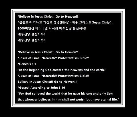 *정통보수 기독교 개신교 성경(The Bible=聖經):*Believe in Jesus Christ!! Go to Heaven!!*정통보수 기독교 개신교 성경(Bible)=예수 그리스도(Jesus Christ).2000여년전 이스라엘 나사렛 예수천당 불신지옥!예수천당 불신지옥! 예수천당 불신지옥!