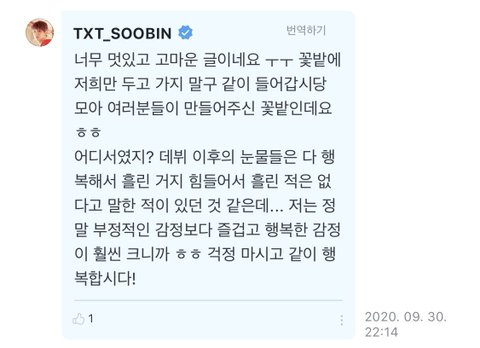 모아분들 덕분에 제가 행복한 것처럼 모아분들도 행복하셨으면 좋겠다라고 말하면서 오열함ㅠㅠ 팬들 행복을 바라며 우는 투바투 리더 수빈이 우리 다섯 너무 고마워ㅠㅠ