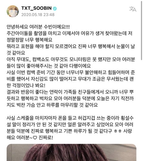 수빈이 사랑해 네 팬이라 너무 행복해 고마워