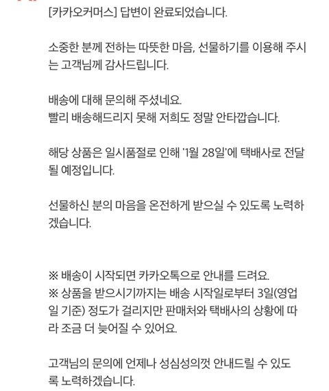 계속 카카오톡에 문의 넣었는데 발송예정일이 1월 28일 이라고 매번 똑같은 답변이 오길래 그냥 오겠지 하고 또 기다렸어