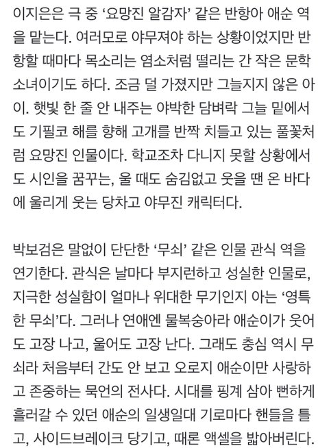 학교조차 다니지 못할 상황에서도 시인을 꿈꾸는 문학소녀, 울 때도 숨김없고 웃을 땐 온 바다에 울리게 웃는 당차고 야무진 캐릭터