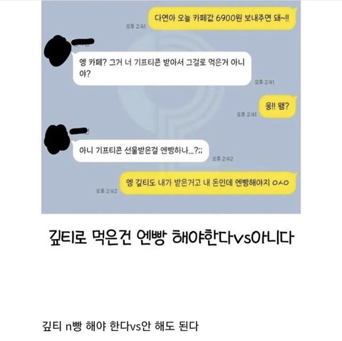 아니 이걸 엔빵한다고? 기프티콘 쓸 땐 내가 쏜다 느낌으로 쓰는 거 아녔음?? 아님 걍 혼자 쓰던가...
