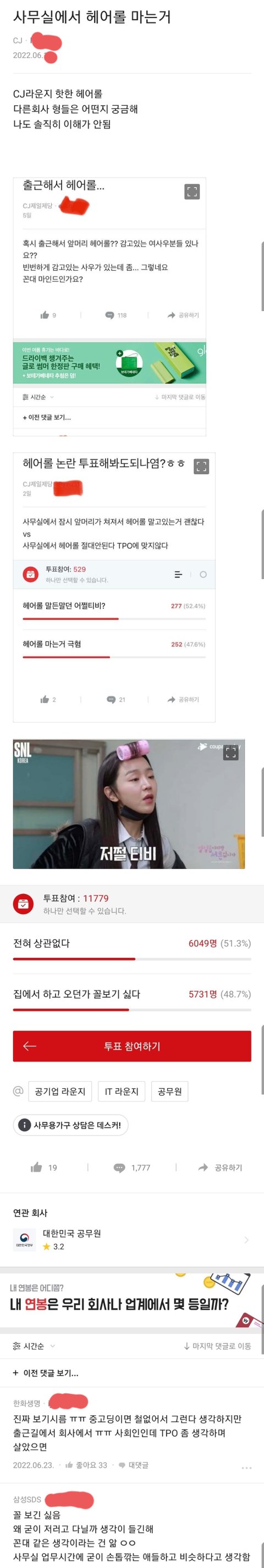 사무실에서 헤어롤 하는 것에 대한 투표결과