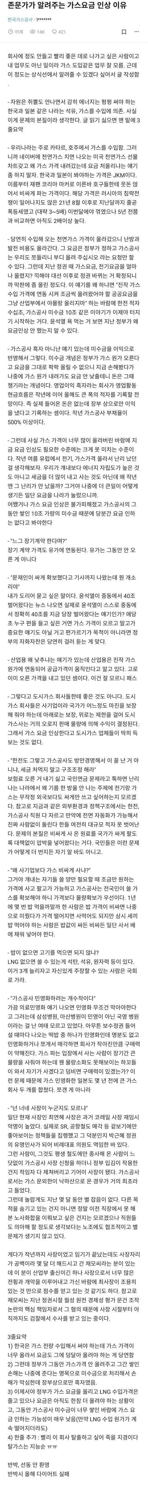 미수금 9조 정리 못하고 여기서 더 쌓이면 가스공사 파산할 수도 있는거고, 파산하면 민영화돼서 독일처럼 8배 이상 천정부지로 오를 수 있는거잖아요..
