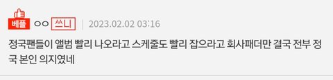 일이 있었으면 이렇게까지는 안있었을라고 얘기하는데 개_소가 방치하고 있다는 반증아님? 와 이걸 어떻게 정국이 자발적으로 스톱시켰다고 생각하노? ㅋㅋㅋㅋㅋㅋ소속사가 외부오퍼 들어오는것도 전달안하고 누락하는건 아미라면 다 아는사실이고 월드컵개막식 역대급반응에도 먹금한게 소속사임