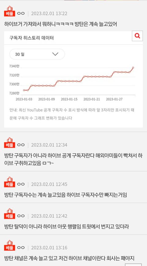 -> 하이브 구독자 수가 떨어진거지, 방탄 공계는 올라가기만 하는 중 (참고로 방탄 티비가 하이브 구독자 제친지 오래고, 나도 하이브 구독 끊음;ㅅㄱ)